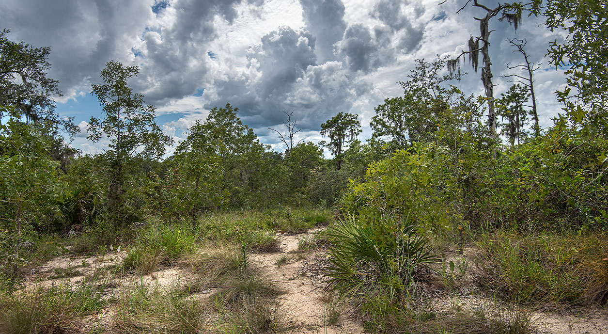 El arenal de Lake Wales Ridge, un paisaje abierto dominado por la hierba y las flores silvestres, presenta un bosque disperso de pinos de hoja larga y robles pavo. Los suelos de arena amarilla y la elevada altitud albergan muchas especies vegetales en peligro de extinción. Aquí prosperan cuatro animales poco comunes: tortugas de tierra, serpientes índigo orientales, eslizones de arena y lagartos de matorral. Mire hacia los árboles para ver pájaros carpinteros, águilas pescadoras ocasionales y búhos chillones. Puede que incluso vea algún eslizón común tratando de confundirse con la corteza de los robles.