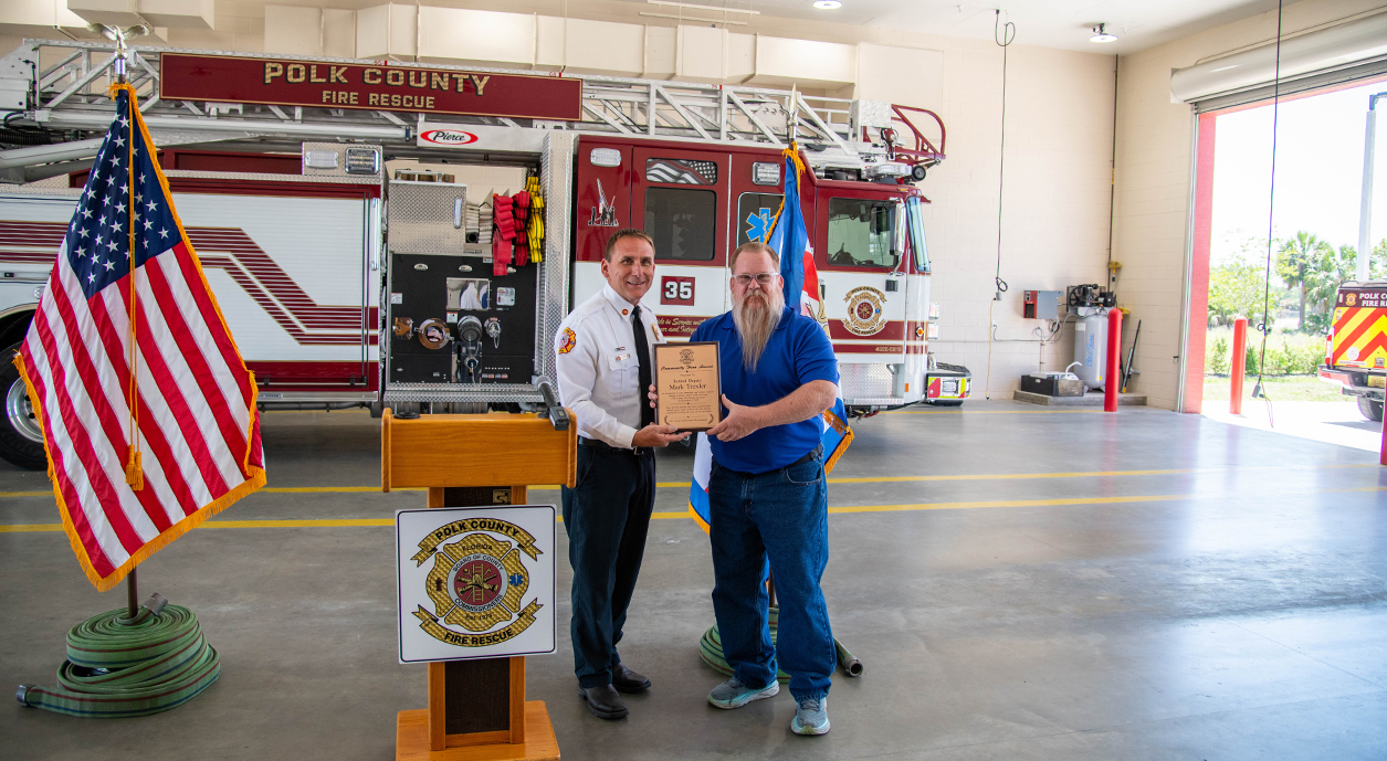 Bartow, Fla. (April 20, 2026) — Retired Polk County Sheriff’s Office Master Deputy Mark Trexler received Polk County Fire Rescue’s (PCFR) first-ever Community Hero Award for his quick actions in getting help for an ambulance crew injured in a crash. Firefighter/Paramedic John Parris and Firefighter/EMT Eryn Orduna were transporting a patient when they were involved in a two-vehicle crash on Dec. 8, 2025.