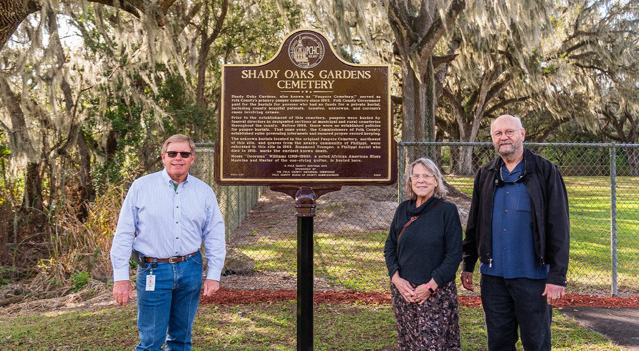 During his remarks at the ceremony, Polk County Commissioner Rick Wilson said, “The placement of this historical marker and the cemetery’s designation as a Polk County Heritage Site resulted from a collaboration among multiple divisions of Polk County government. From Roads and Drainage to Real Estate Services, from Facilities Management to Health and Human Services, as well as Parks and Natural Resources, they all understood and valued the importance of honoring every single one of the individuals who are interred at Shady Oaks Gardens.”